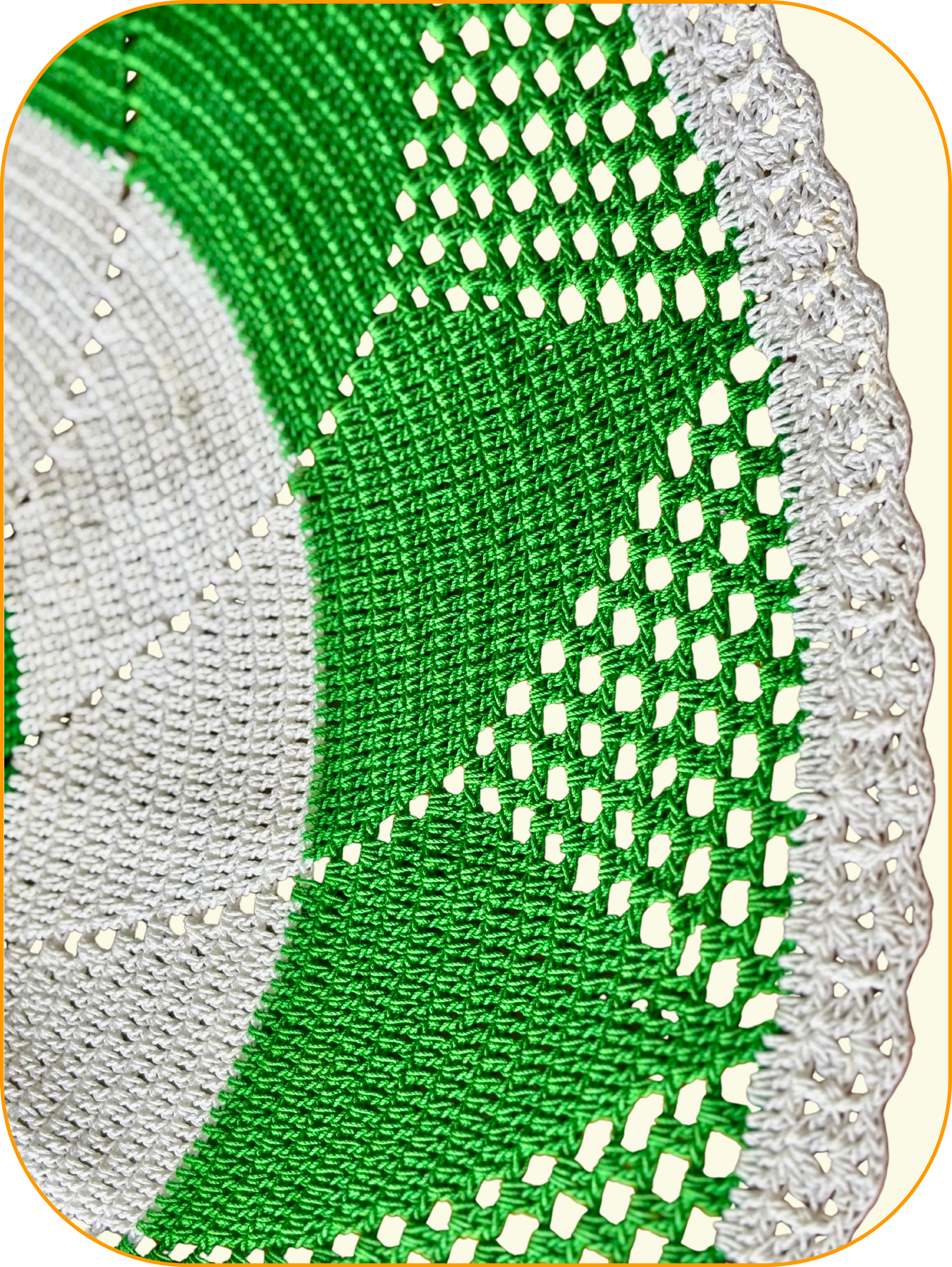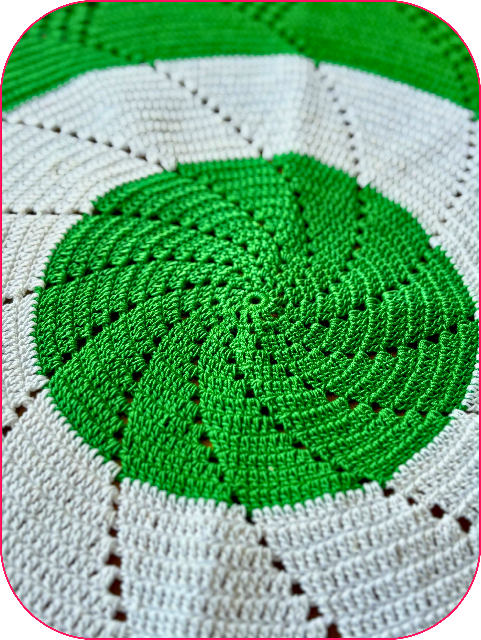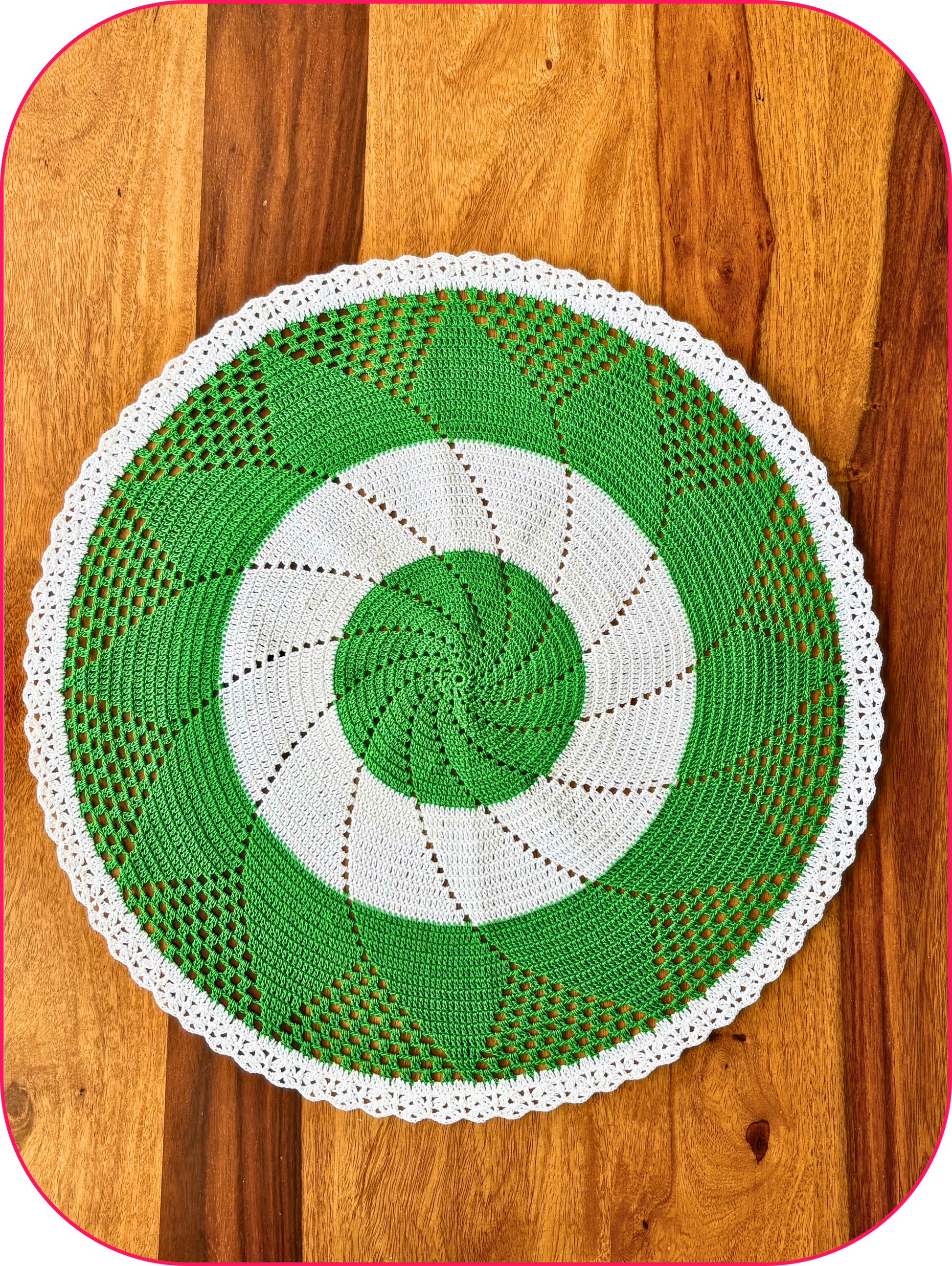 This handmade crochet doily features a fresh green-and-white swirl framed with a delicate lace border. The spiral design adds movement and charm, while the leafy pattern around the edges brings a touch of nature indoors. Soft yet sturdy, it makes a lovely centerpiece for your dining or coffee table. Perfect for adding a pop of color to your home décor or gifting to someone who loves artisanal details.