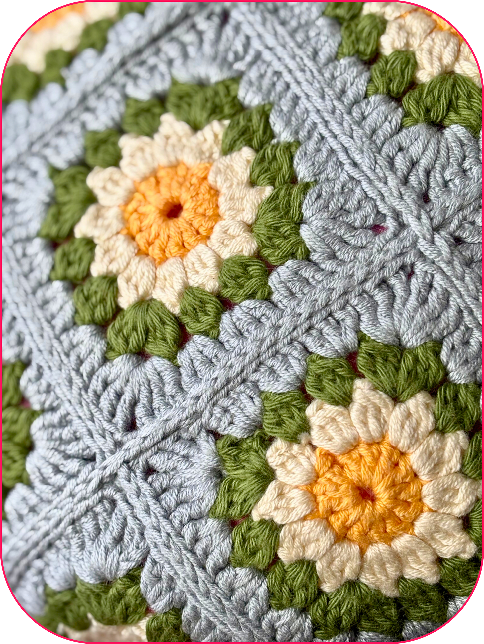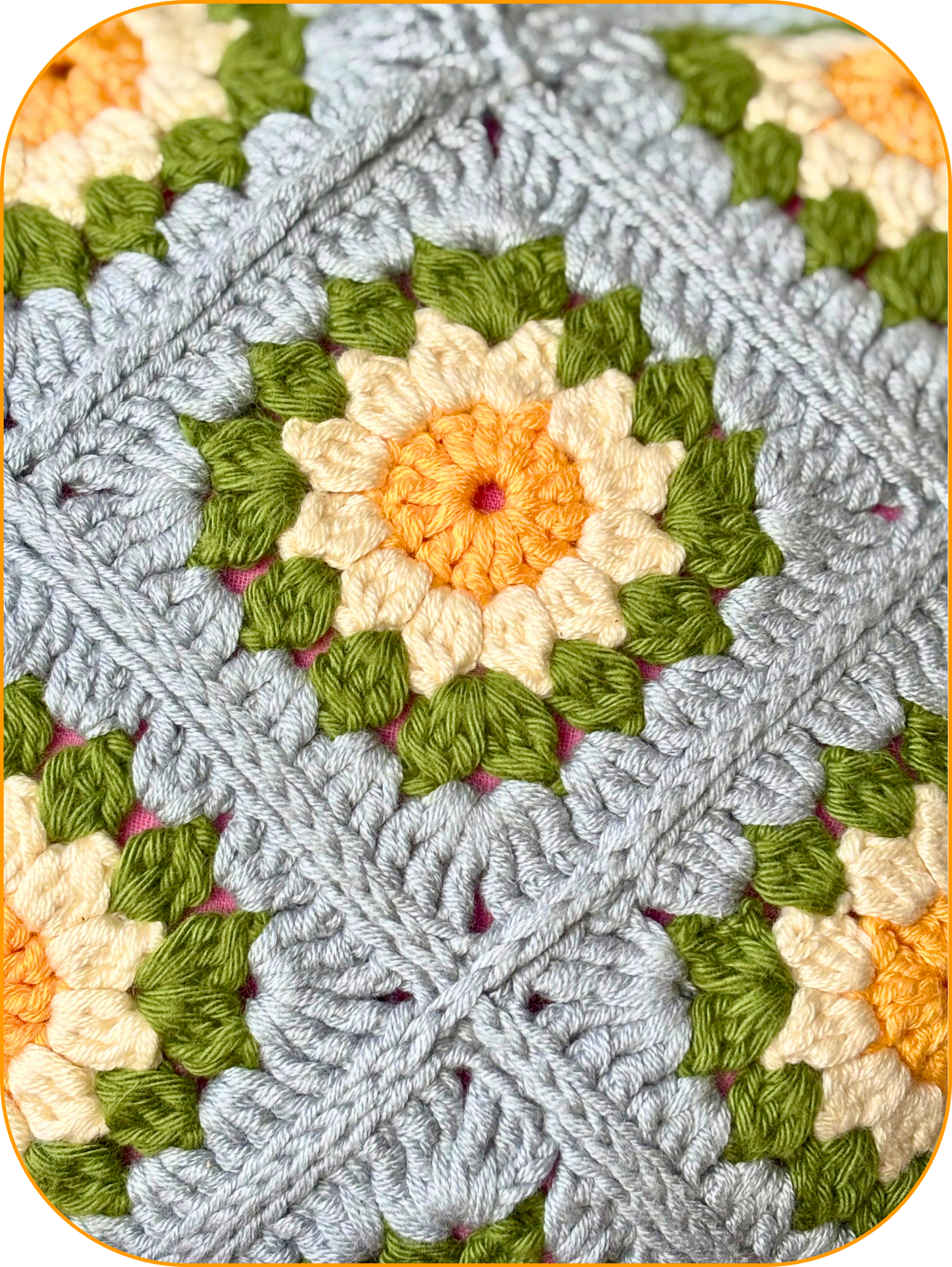 This crochet shoulder bag features soft floral motifs in cream and golden yellow, framed with leafy green and set against a gentle grey base. Its slouchy shape and long strap make it comfortable to wear, whether for errands, outings, or everyday carry. The textured granny-square design adds a handmade charm that feels both vintage and fresh. A versatile piece that pairs beautifully with casual looks and makes a thoughtful, one-of-a-kind gift.