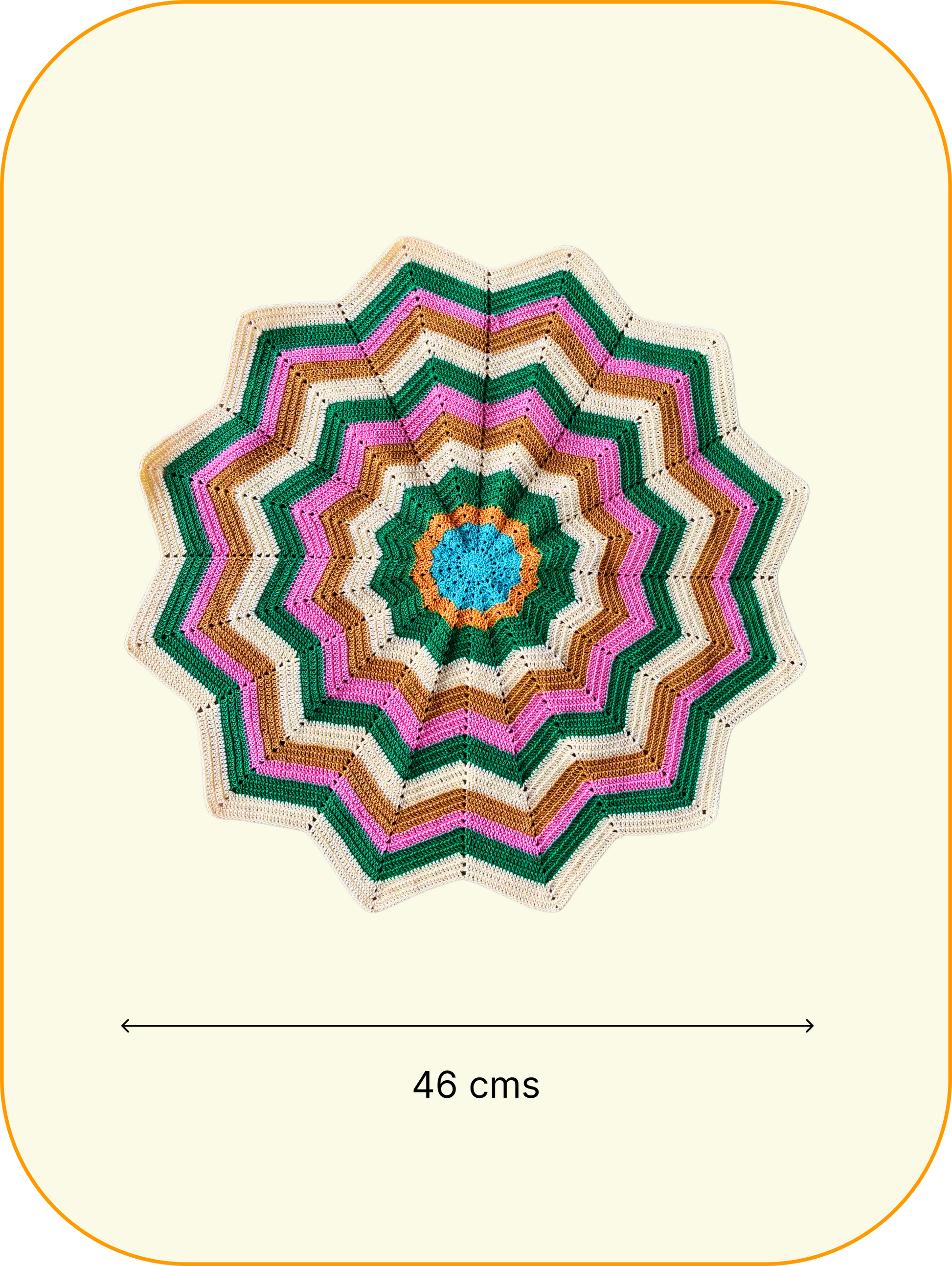 This vibrant crochet doily bursts with color, featuring sunlit golds, earthy greens, warm browns, and playful pops of pink around a cheerful blue center. Its starburst pattern creates a bold, wavy edge that instantly draws the eye. Handmade with care, it brings a lively accent to any table or shelf. Perfect for brightening your home décor or gifting to someone who loves unique, handcrafted treasures.