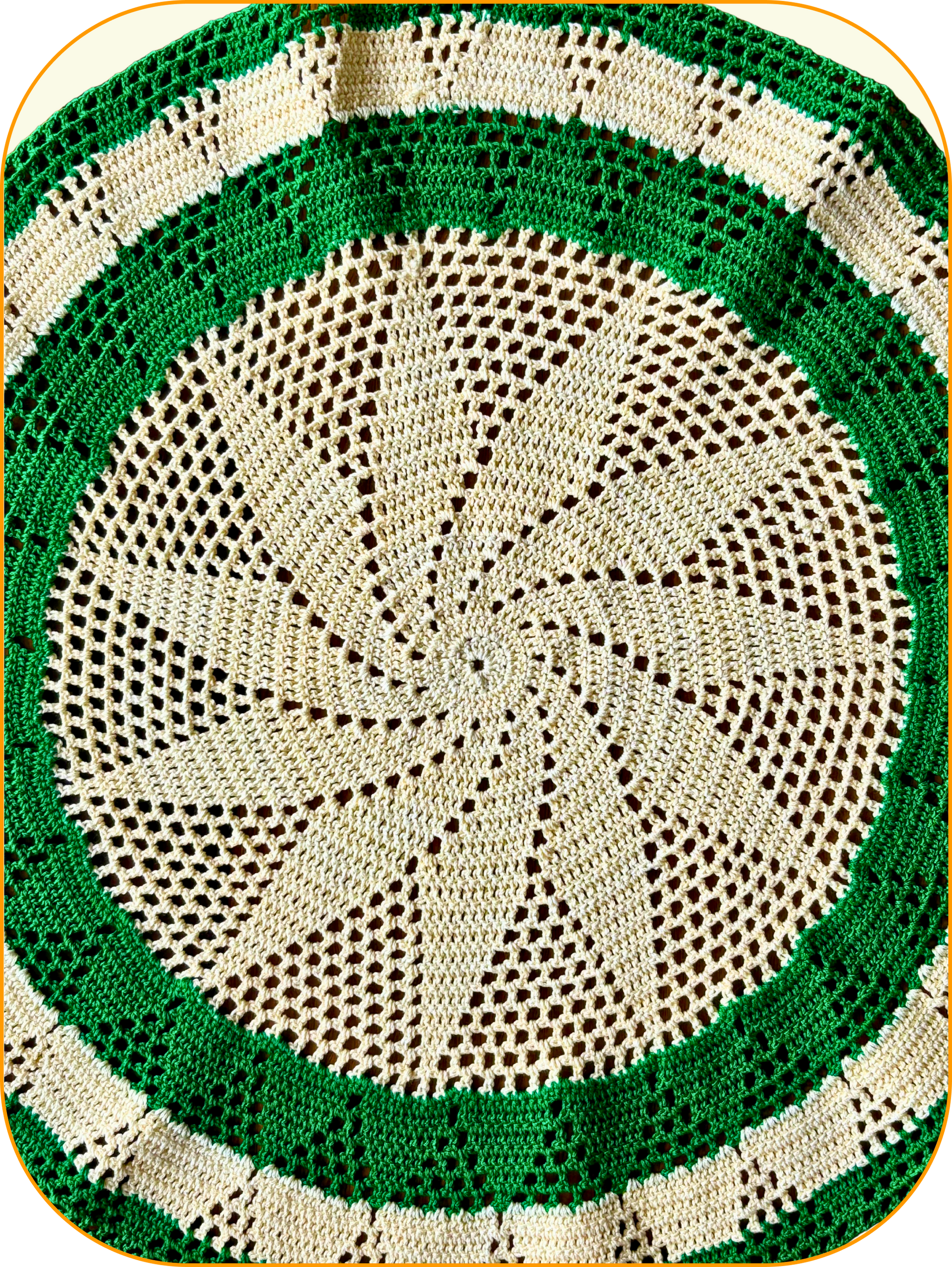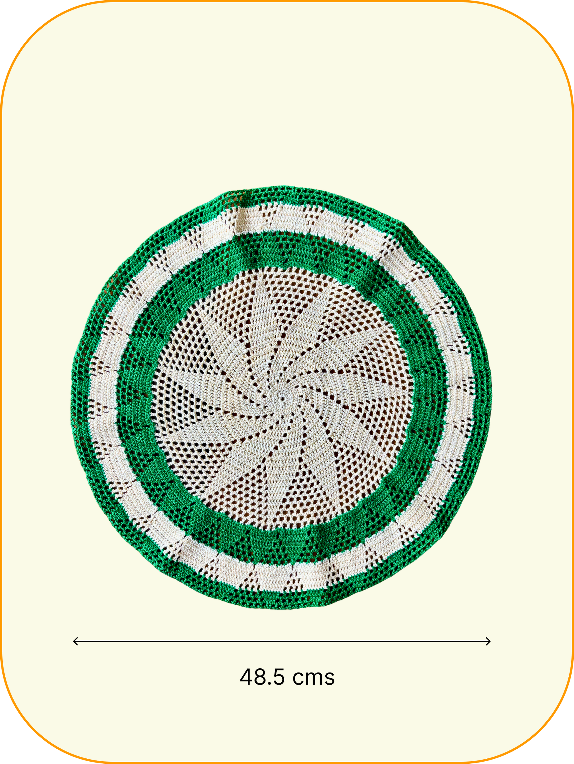This crochet doily features a graceful spiral center that blooms outward into a striking green-and-white pattern. The design resembles petals unfurling, framed by alternating bands of color that give it a lively yet balanced look. Lightweight and delicately woven, it adds an artisanal charm to any table or shelf. A beautiful choice for brightening everyday décor or gifting as a handmade keepsake.