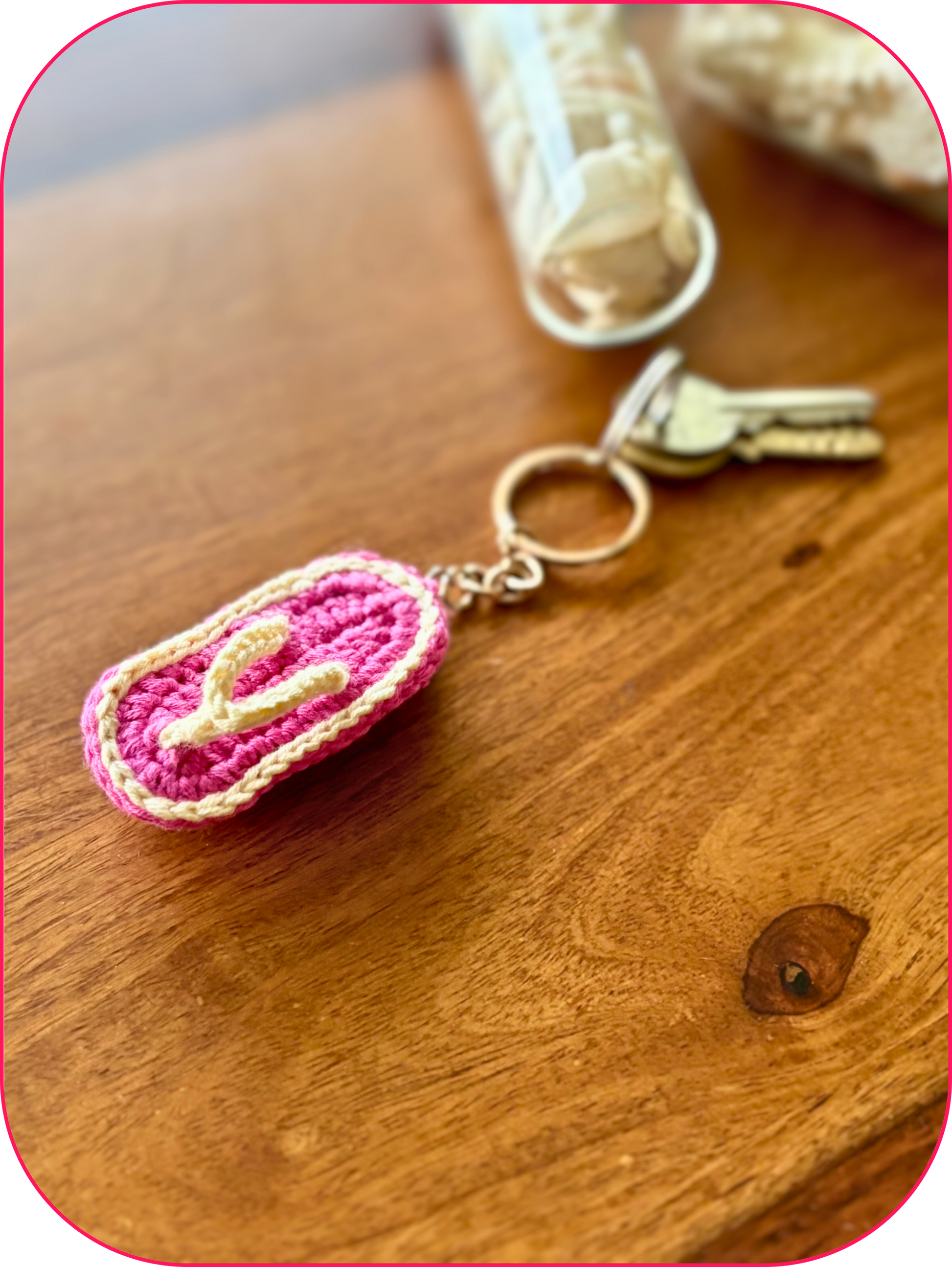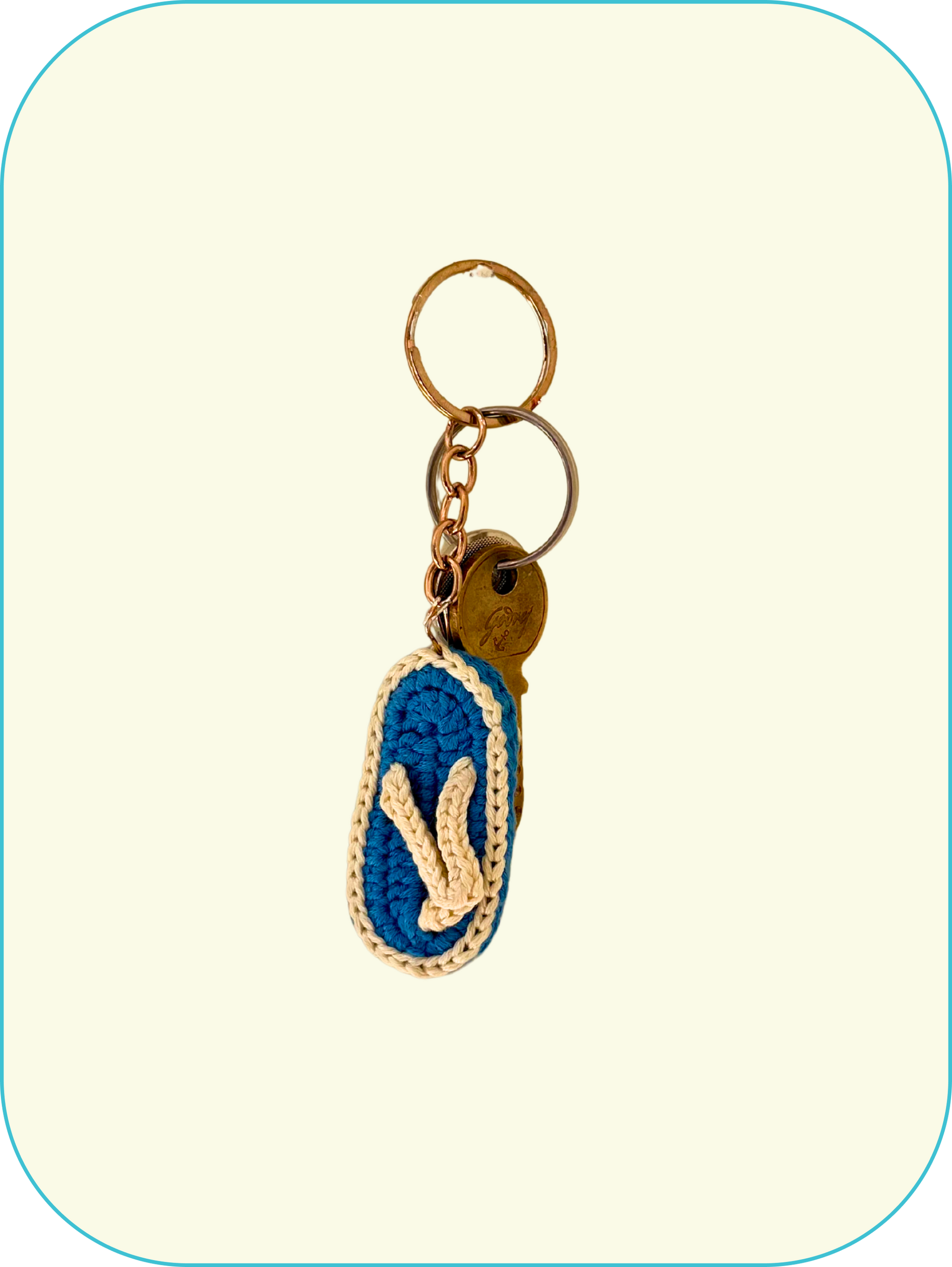 This crochet keychain comes in the playful shape of a tiny slipper, available in blue or pink with cream straps. Lightweight and sturdy, it brings a fun, beachy vibe to your everyday keys. Its soft texture makes it easy to spot in your bag while adding a handmade charm. A quirky little accessory that also makes a cheerful gift or party favor.