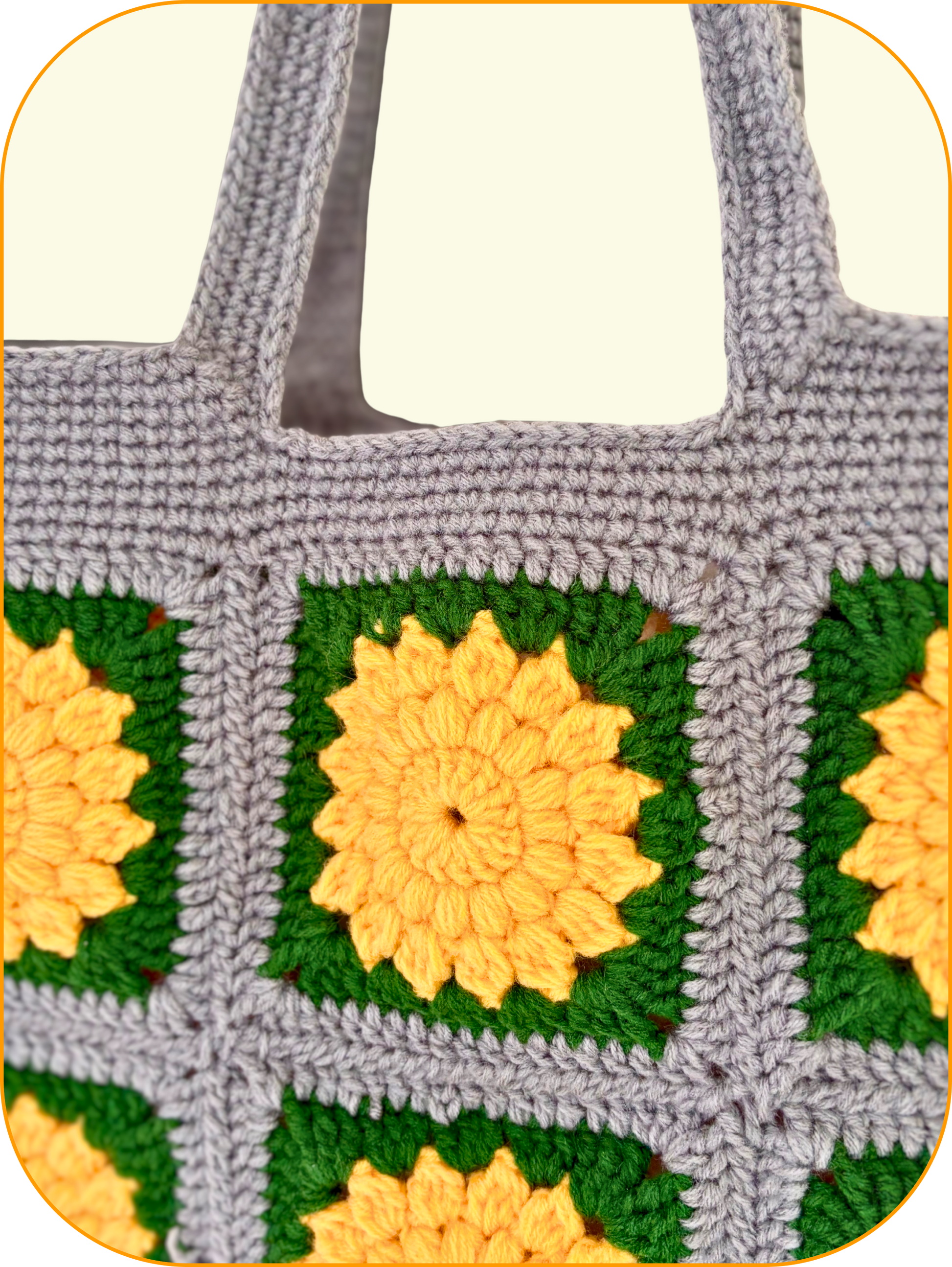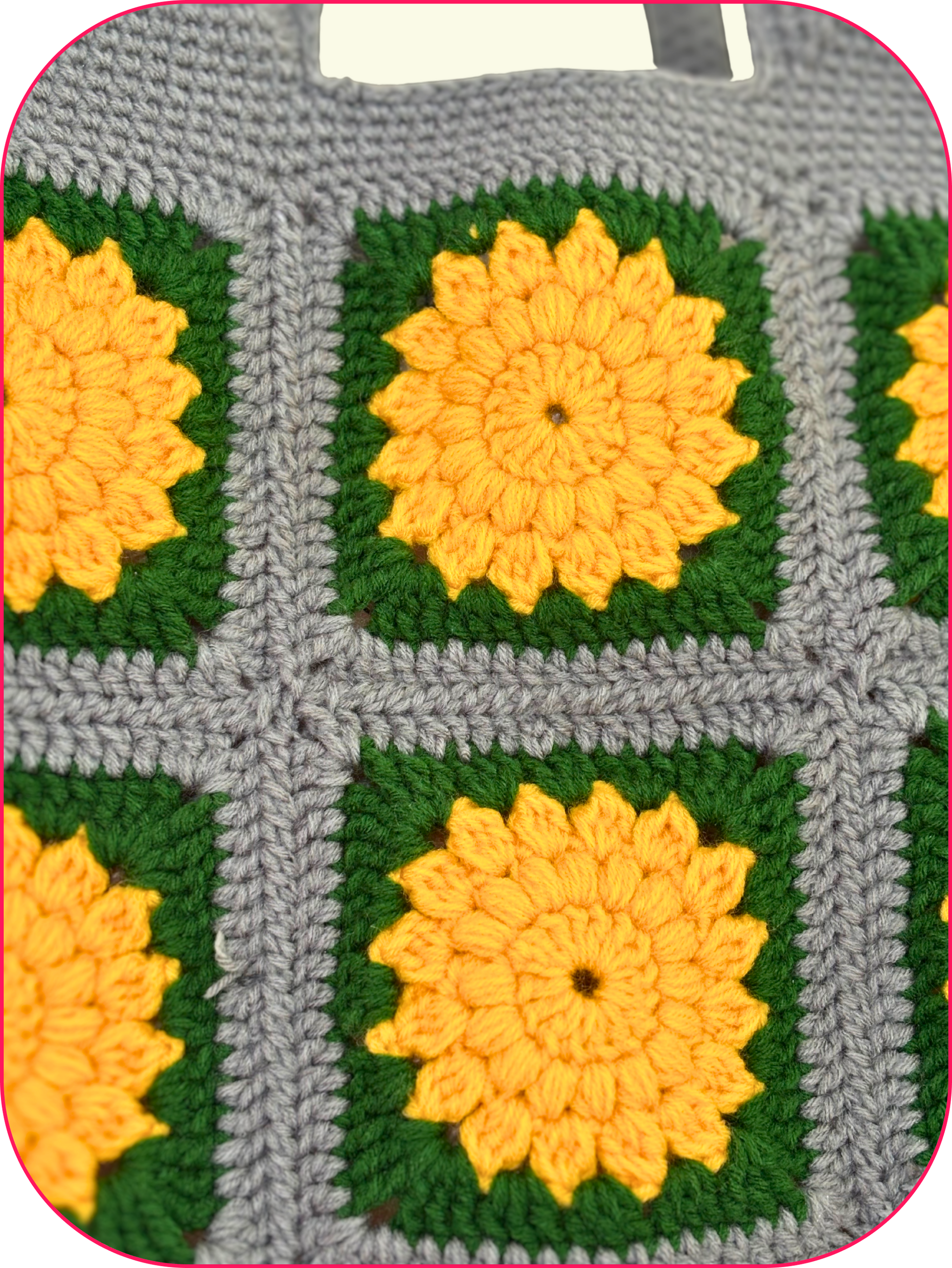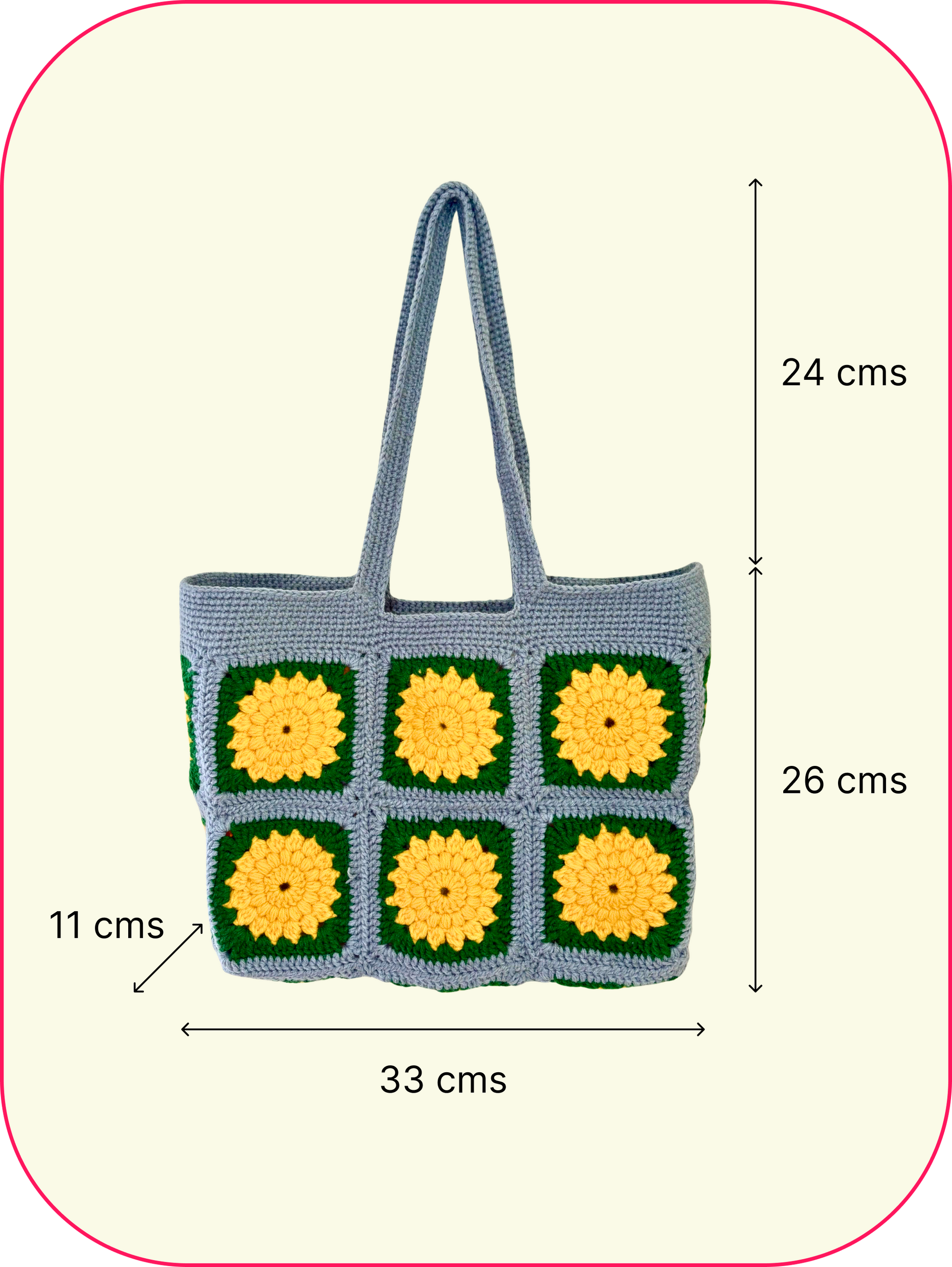 This crochet tote bag brings sunshine wherever you go, with bright yellow flower motifs set against green squares and a soft grey base. Spacious and sturdy, it’s designed to hold your everyday essentials while adding a cheerful, handmade touch to your outfit. The long handles make it easy to carry on the shoulder or by hand. Perfect for market trips, casual outings, or gifting to someone who loves unique, artisanal accessories.